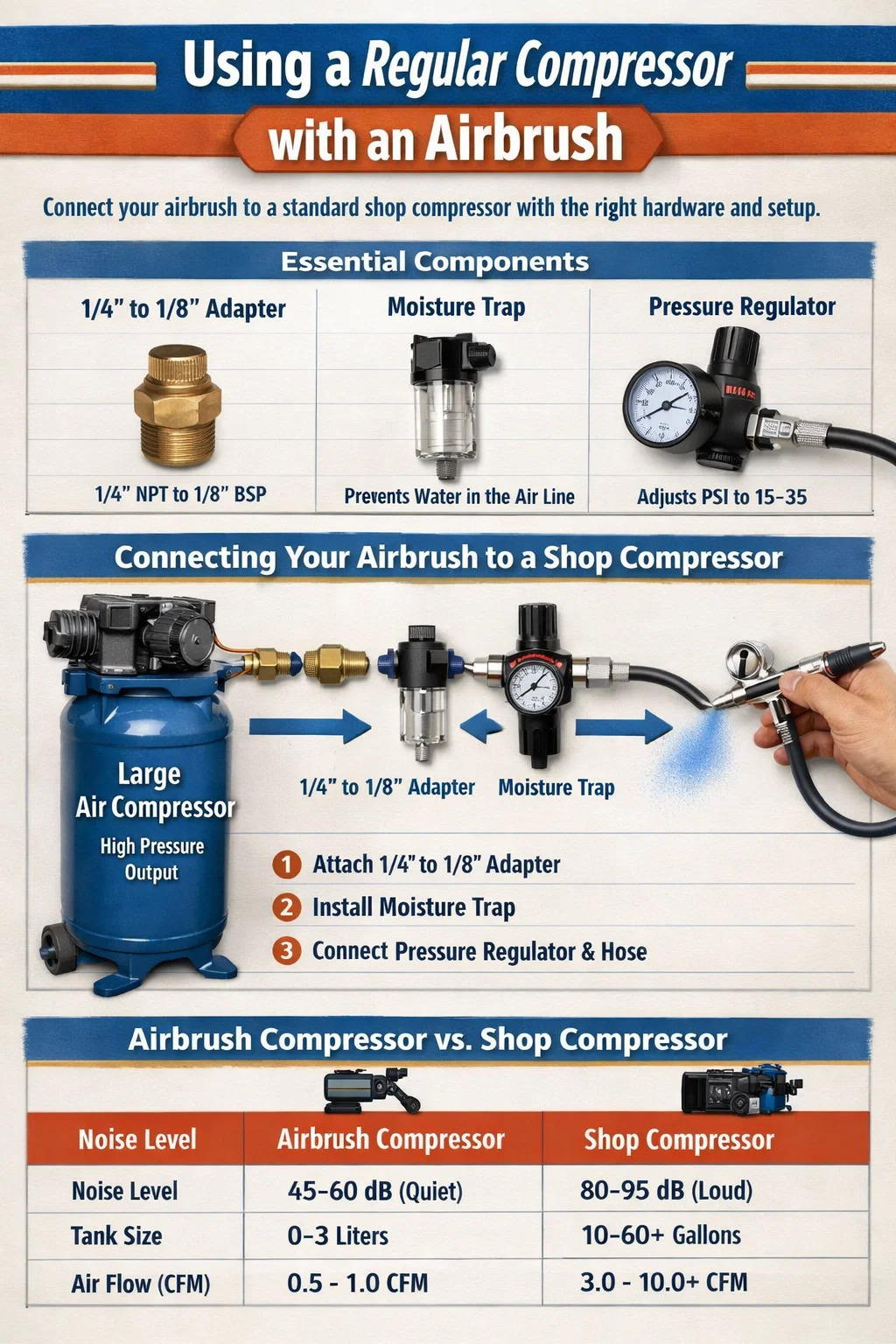 Du Es ist durchaus möglich, eine Airbrush mit einem normalen Werkstatt- oder Garagenkompressor zu betreiben , vorausgesetzt, Sie haben die richtigen Adapter und eine Möglichkeit, den Druck zu regulieren. Während spezielle Airbrush-Kompressoren für einen leisen Niederdruckbetrieb ausgelegt sind, ist ein Standard-Großkompressor durchaus in der Lage, den erforderlichen Luftstrom bereitzustellen. Tatsächlich bevorzugen viele professionelle Maler normale Kompressoren, weil ihre Große Vorratstanks sorgen für einen absolut gleichmäßigen, pulsationsfreien Luftstrom dass kleine, tanklose Airbrush-Modelle oft Schwierigkeiten haben, mithalten zu können.