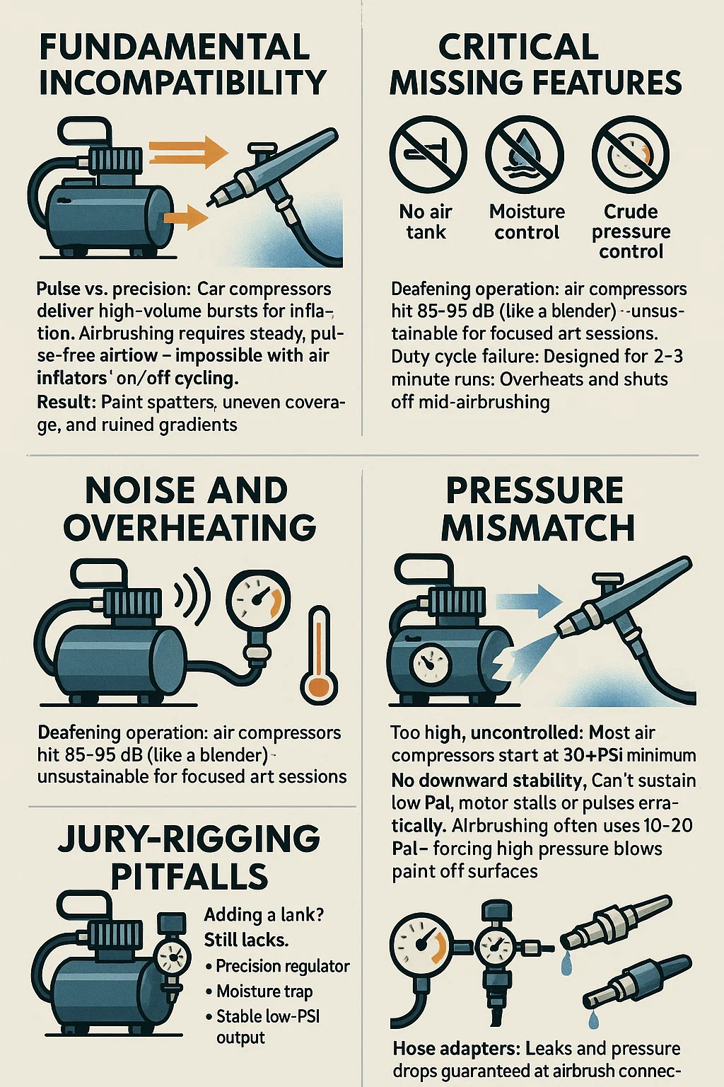 Impuls vs. Präzision: Autokompressoren liefern hochvolumige Stöße zum Aufpumpen. Beim Airbrushen ist ein gleichmäßiger, impulsfreier Luftstrom erforderlich, was mit dem Ein- und Ausschalten der Luftpumpen nicht möglich ist.