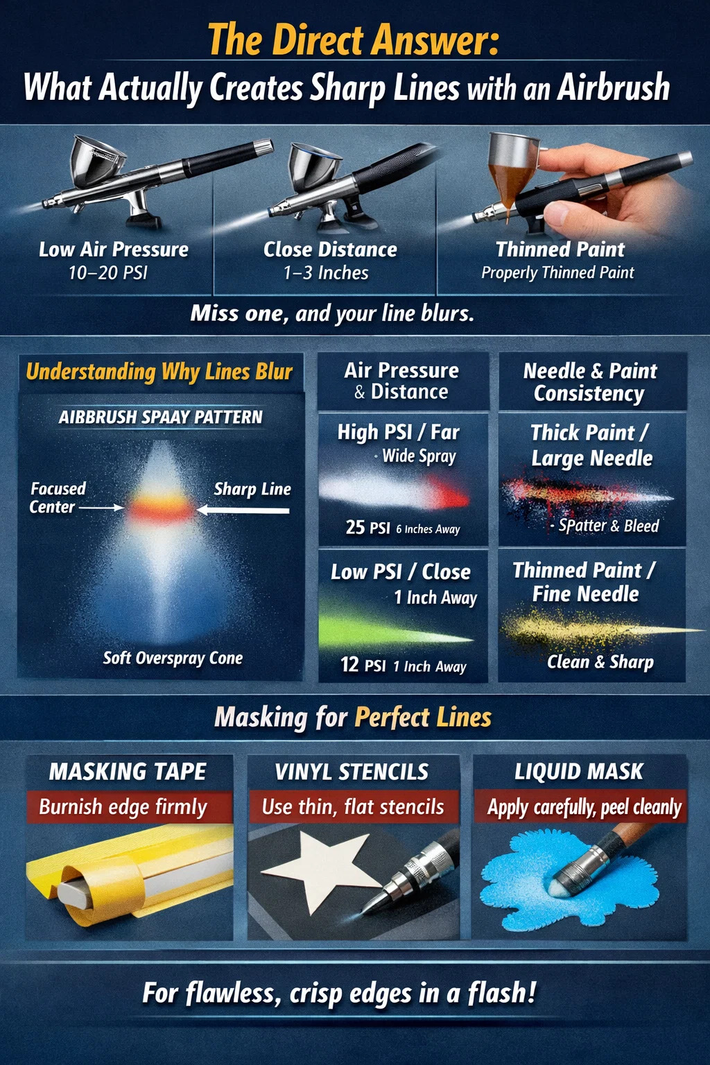Scharfe Linien mit einer Airbrush sind auf das Zusammenwirken von vier Kernvariablen zurückzuführen: niedriger Luftdruck (normalerweise 10–20 PSI) , einen geringen Arbeitsabstand (2,5–7,6 cm von der Oberfläche entfernt), richtig verdünnte Farbe und bewusste Abzugskontrolle. Wenn Sie auch nur eines davon verpassen, wird Ihre Linie weicher, blutet oder spritzt. Die meisten Anfänger haben Schwierigkeiten, weil sie zu weit von der Oberfläche entfernt arbeiten und zu viel Druck ausüben – zwei Gewohnheiten, die die Präzision sofort zerstören.